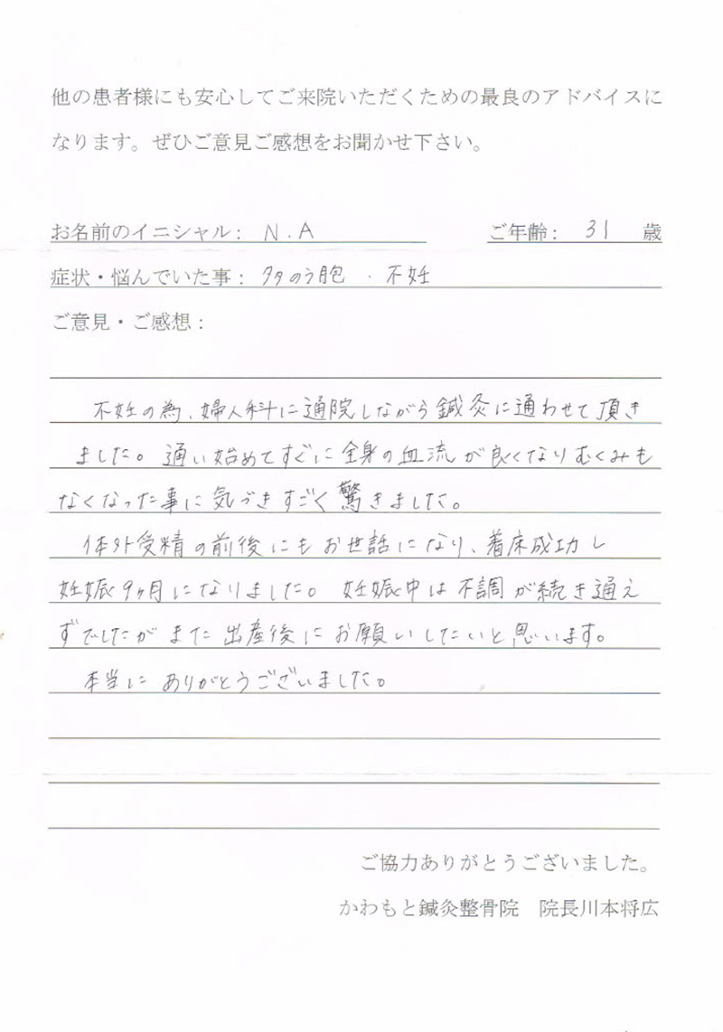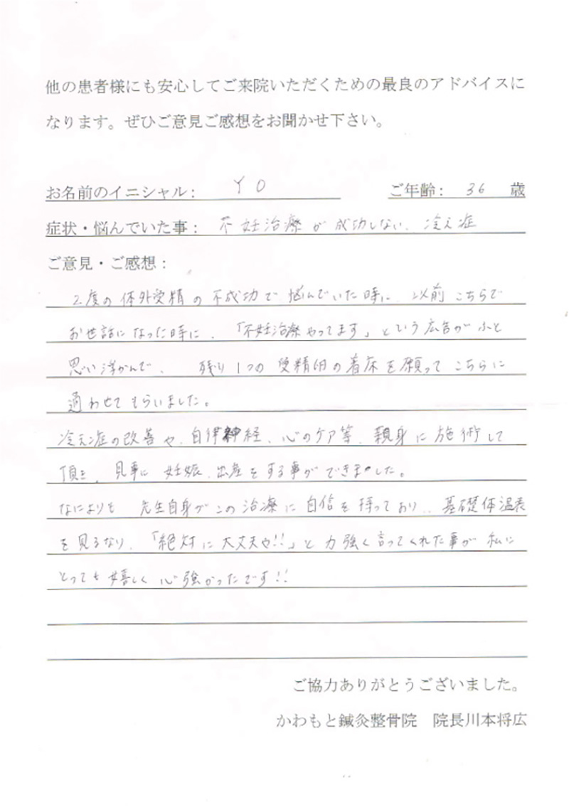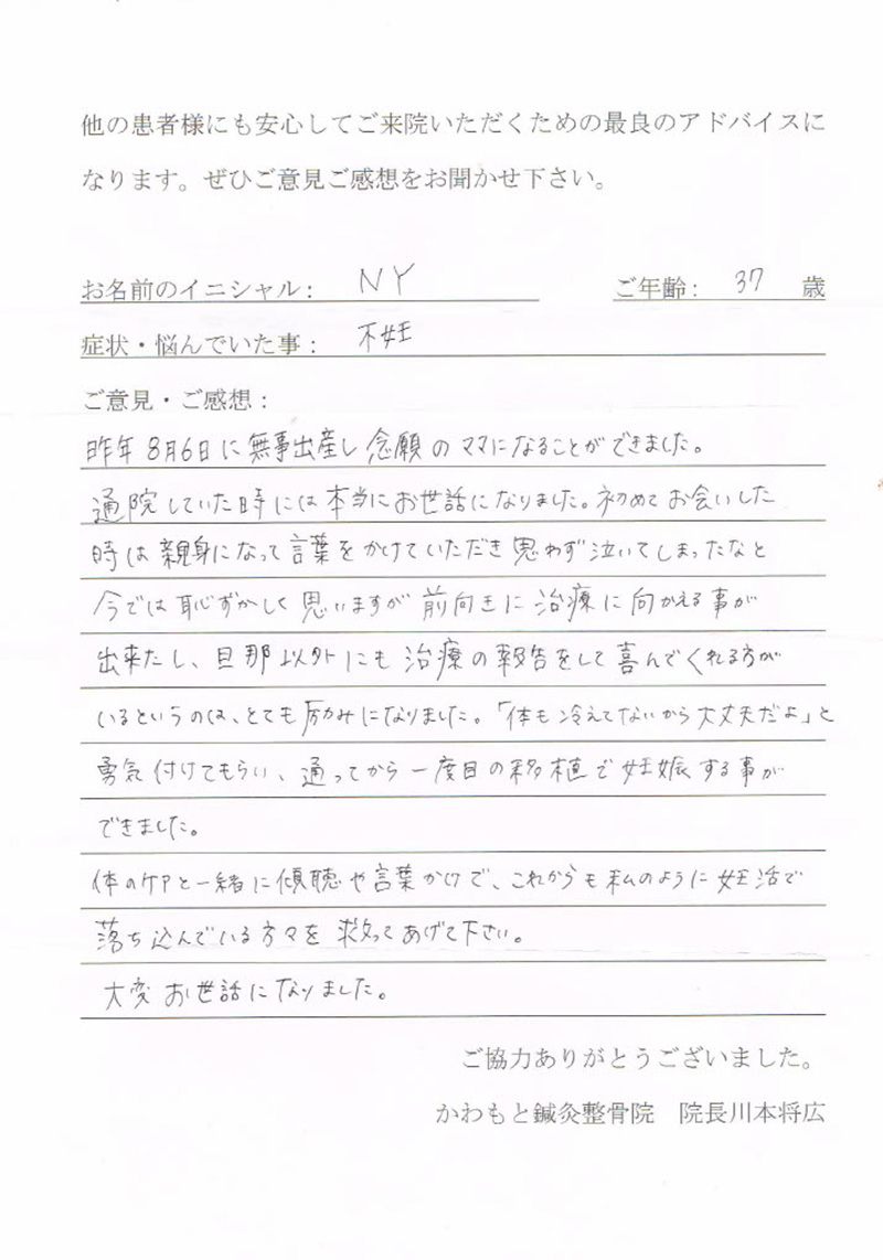 通院していた時には本当にお世話になりました。初めてお会いした時は親身になって言葉をかけていただき思わず泣いてしまったなと今では恥ずかしく思いますが前向きに治療に向かえる事が出来たし、旦那以外にも治療の報告をして喜んでくれる方がいるというのは、とても励みになりました。「体も冷えてないから大丈夫だよ」と勇気付けてもらい、通ってから一度目の移植で妊娠する事ができました。