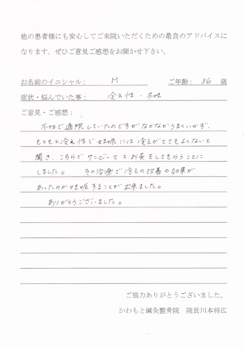 その治療で冷えの改善の効果があったのか妊娠することが出来ました。