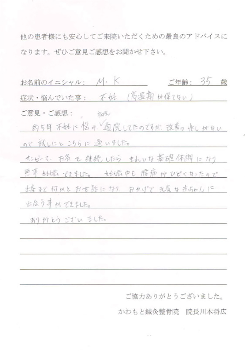 サンビーマ・お灸を継続したら、きれいな基礎体調になり無事妊娠できました。妊娠中も腰痛がひどくなったので出産まで何かとお世話になり、おかげで元気な赤ちゃんに出会うことが出来ました。