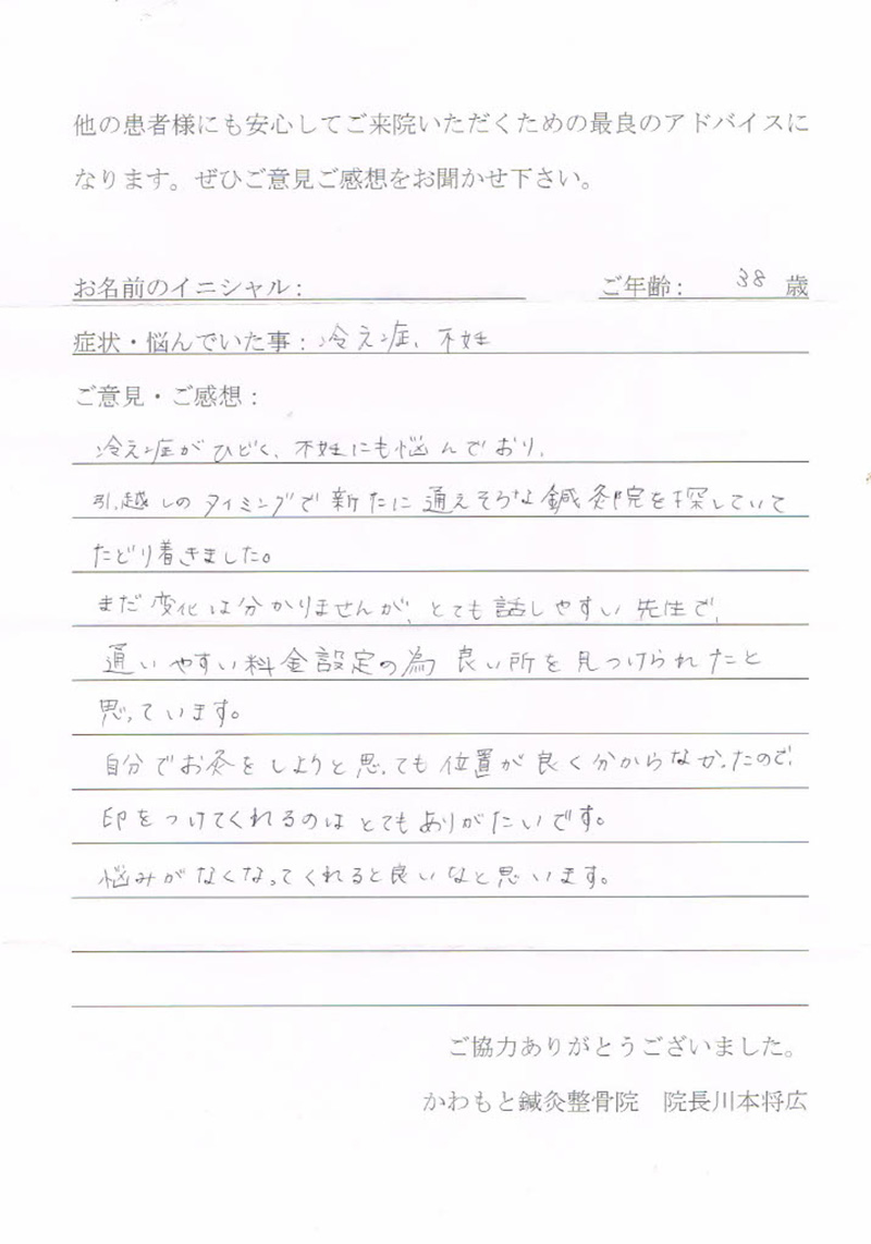 不妊で通院していたのですがなかなかうまくいかず、もともと冷え性で妊娠には冷えがとてもよくないと聞き、こちらでサンビーマとお灸をしてもらうことにしました。